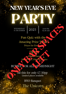 Our Sunday Quiz starts at 8:30pm – best get in earlier to secure a table – £3 per person